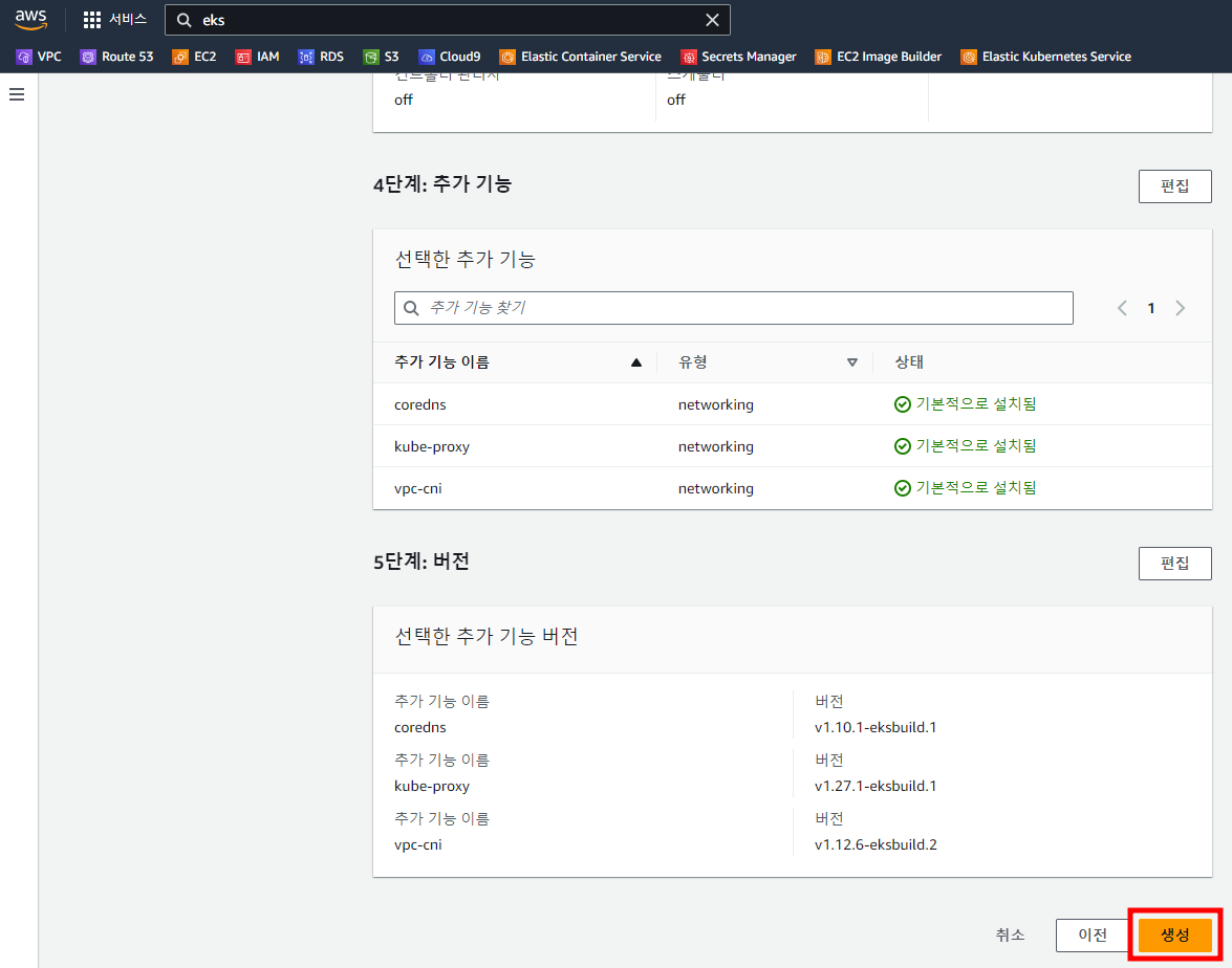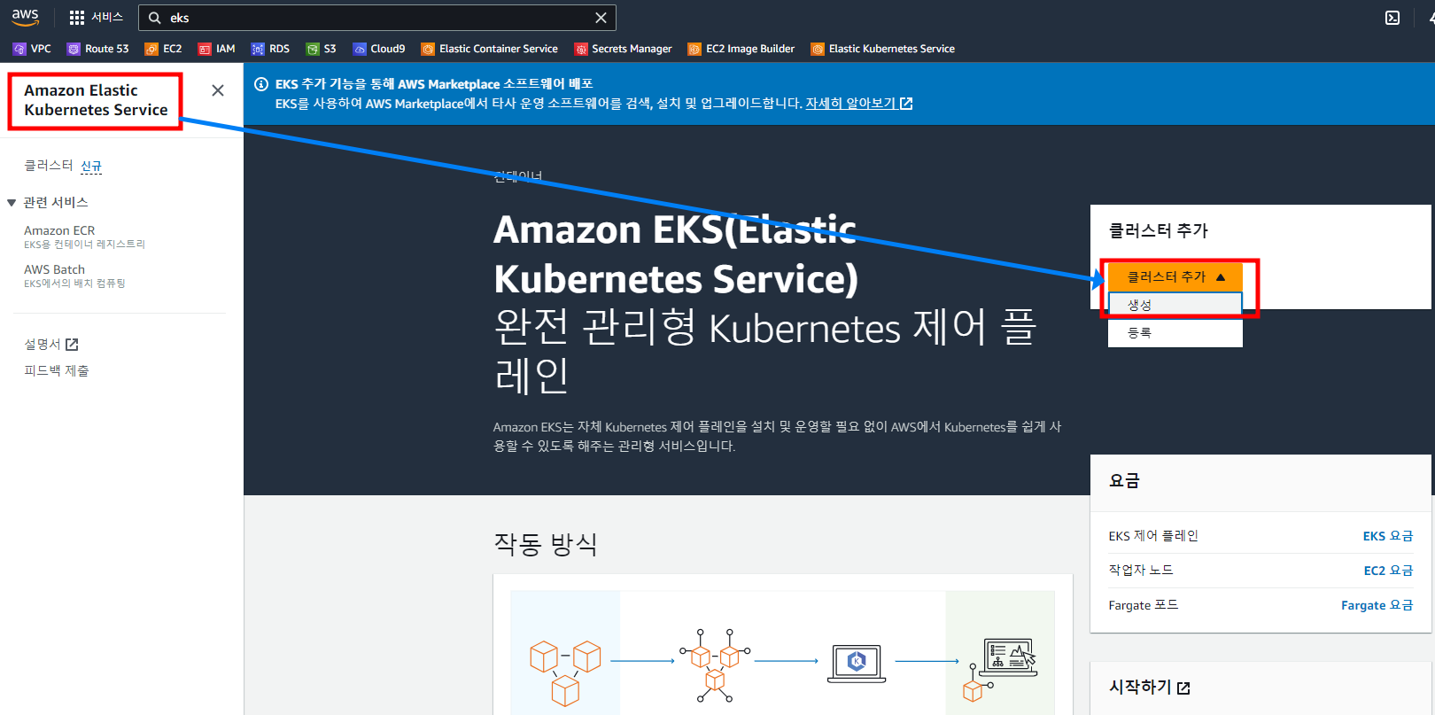 2.1. EKS 서비스로 이동 -> 클러스터 추가 -> 생성 클릭