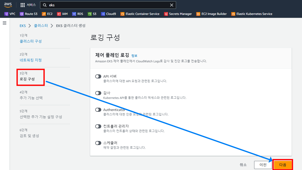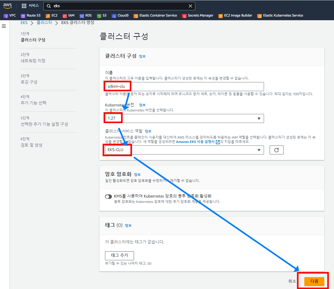 1.1.2. AWS 서비스 -> EKS 검색 -> EKS-Cluster 선택 -> 다음