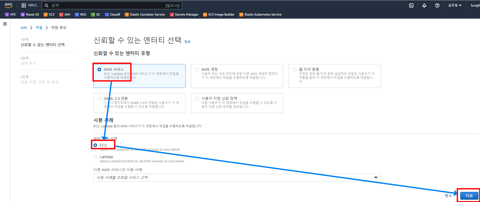 1.2.2. AWS 서비스 선택 -> EC2 선택 -> 다음