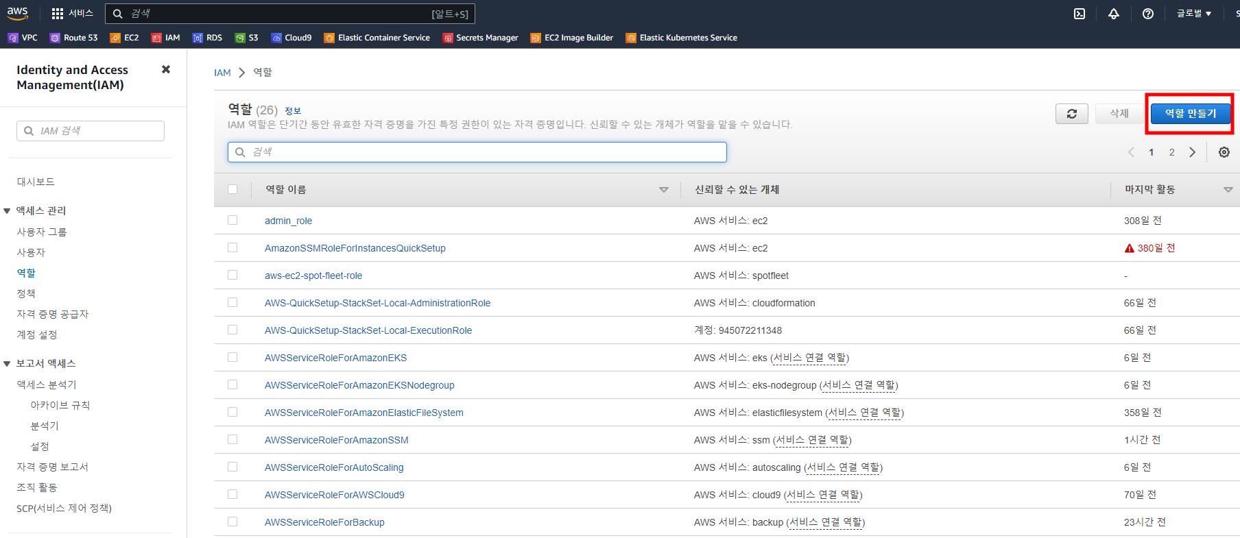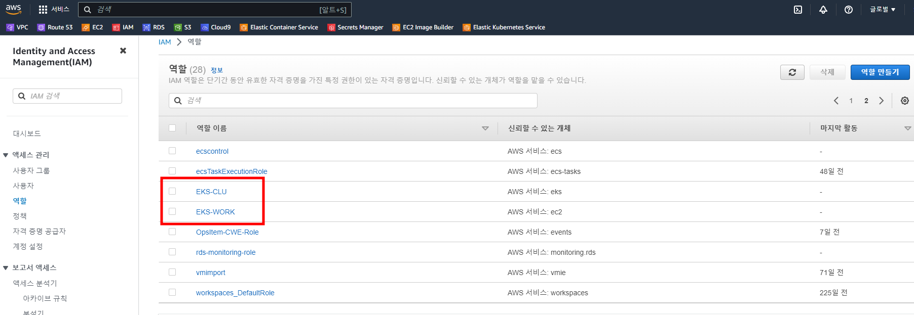 1.2.1. Master Node 역할 (EKS_CLU) 확인 후 역할 만들기 클릭