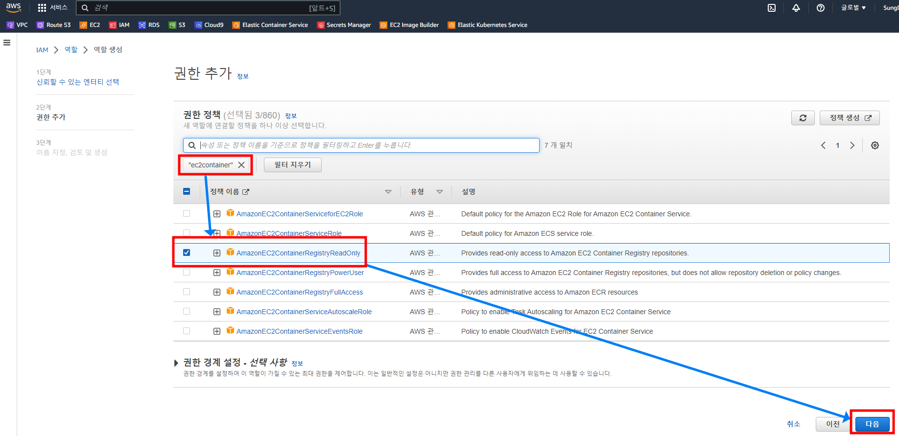 1.2.4. 필터 해제 후 AmazonEC2ContainerRegistryReadOnly 선택 -> 다음