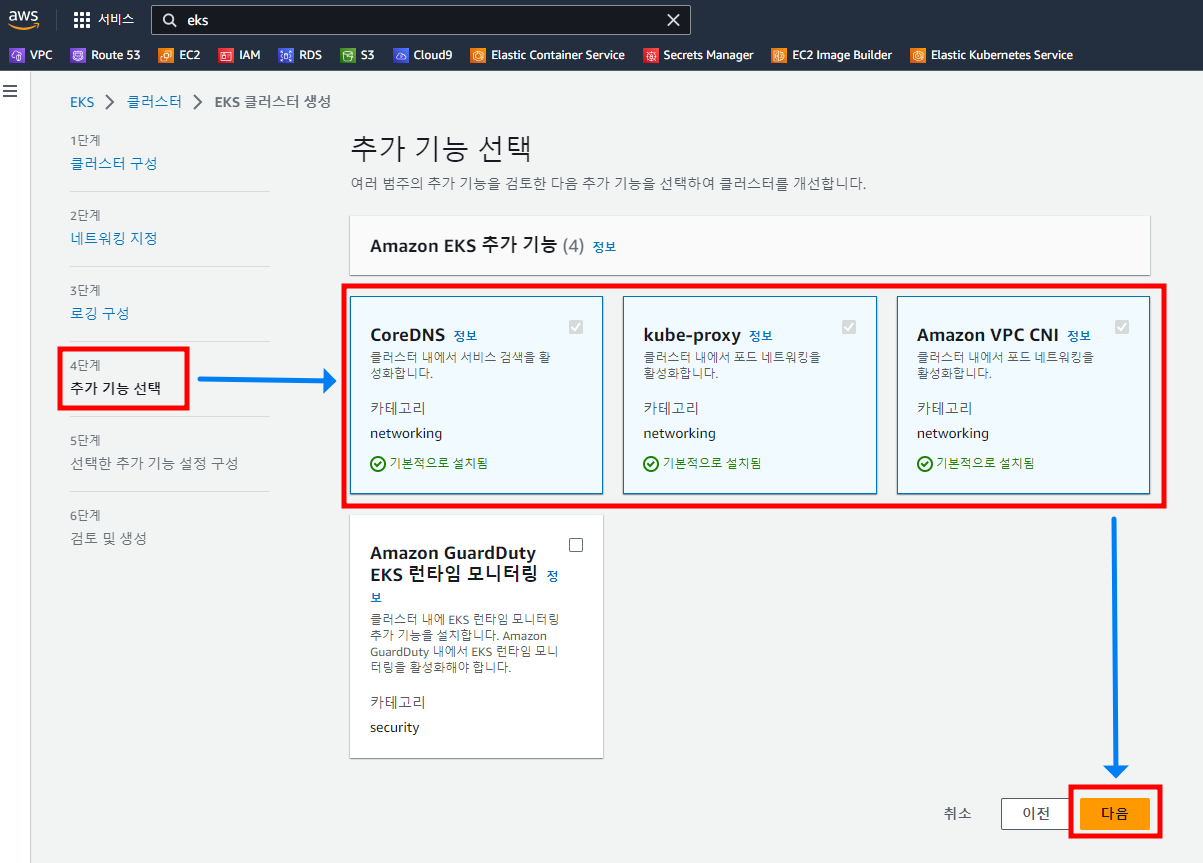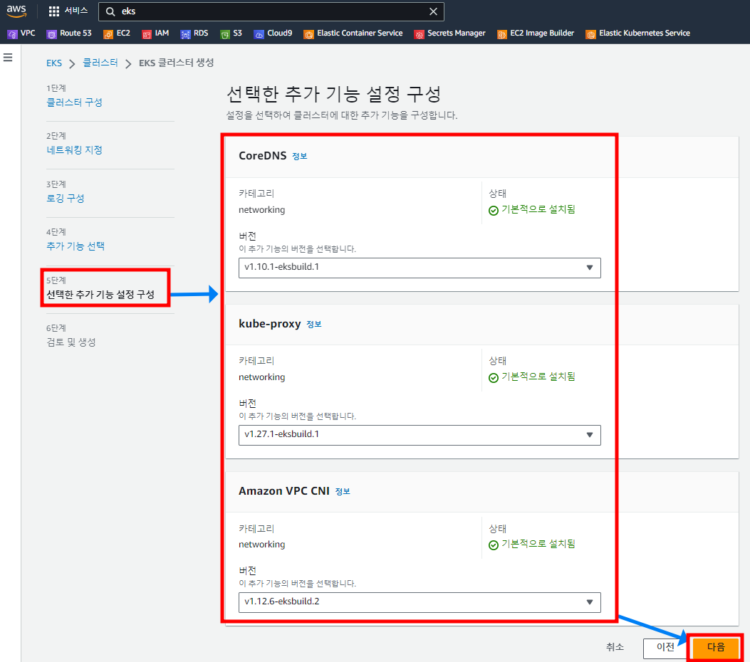 2.5.1. 기본값: CoreDNS, kube-proxy, Amazon VPC CNI 선택 후 다음