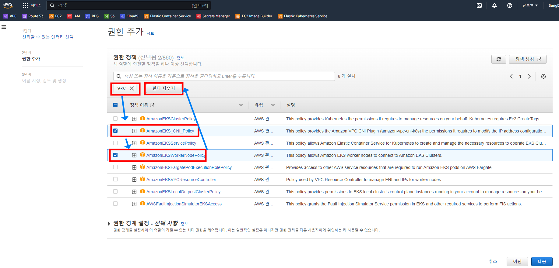 1.2.3. 권한 추가 -> 권한 정책 eks 검색 -> AmazonEKS_CNI_Policy, AmazoneEKS_WorkerNode_Policy 선택