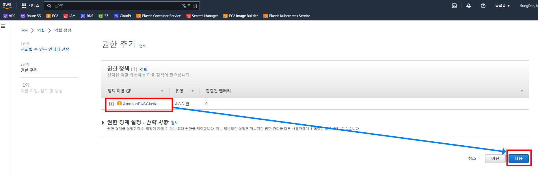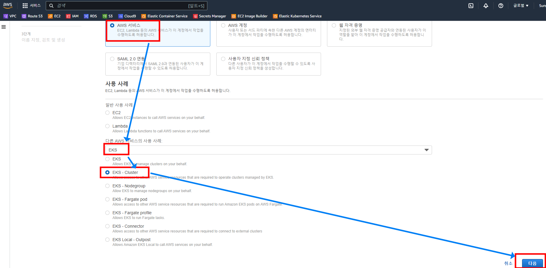 2.2.3. 서비스 역할: EKS_CLU (1.1에서 생성) 선택 후 다음