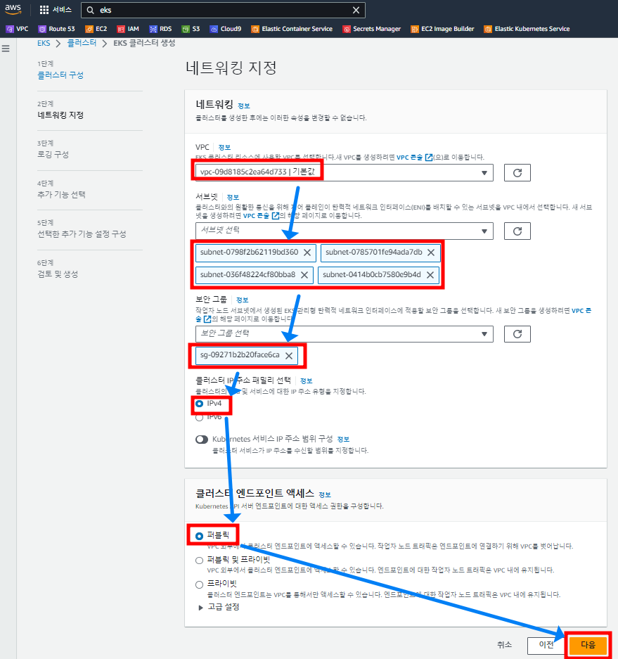 2.3.5. 클러스터 앤드포인트 액세스: 퍼블릭(외부 접속 가능) -> 다음