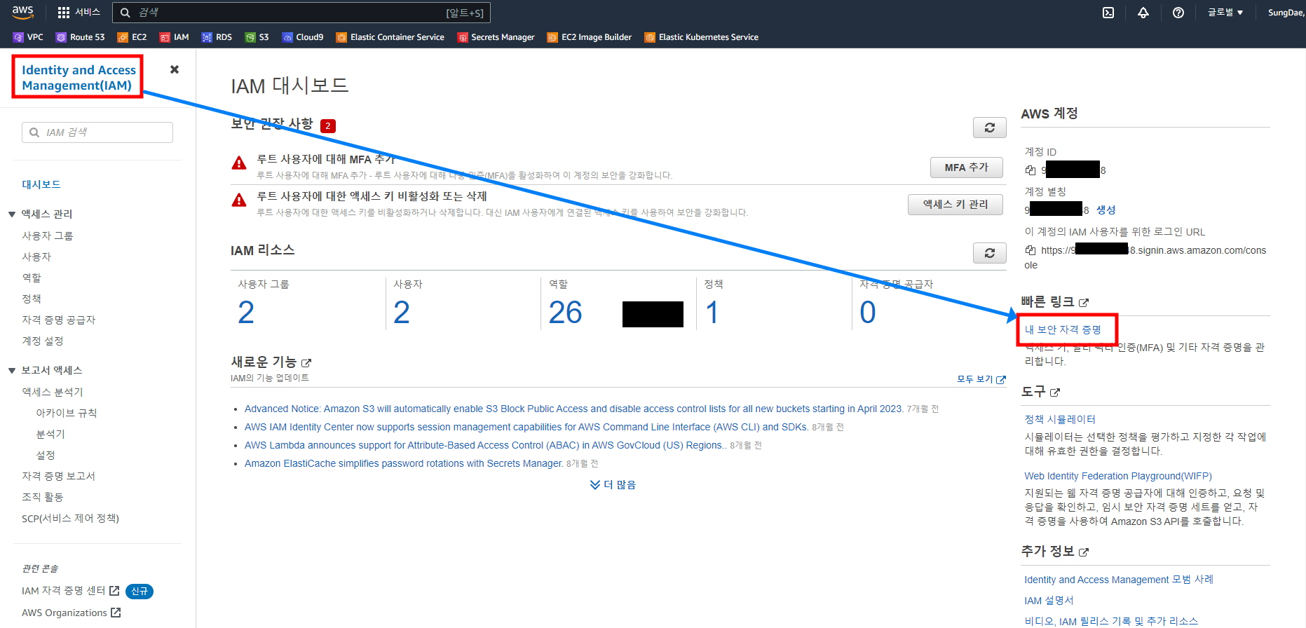 1.1. IAM -> 내 보안 자격증명 클릭