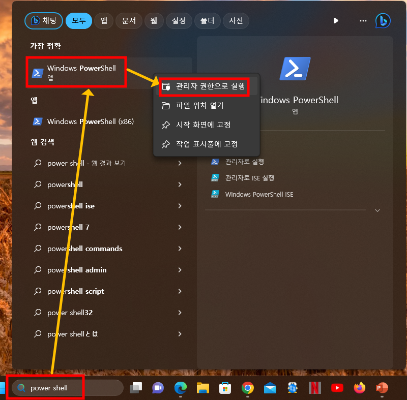 3.1.1. 검색창에 powershell 입력 -> Windows PowerShell 앱 선택 후 -> 관리자 권한으로 실행