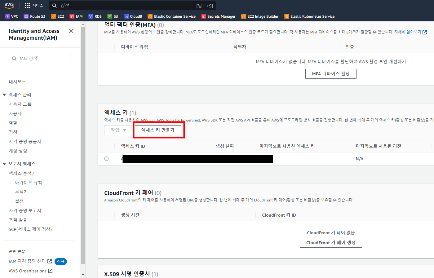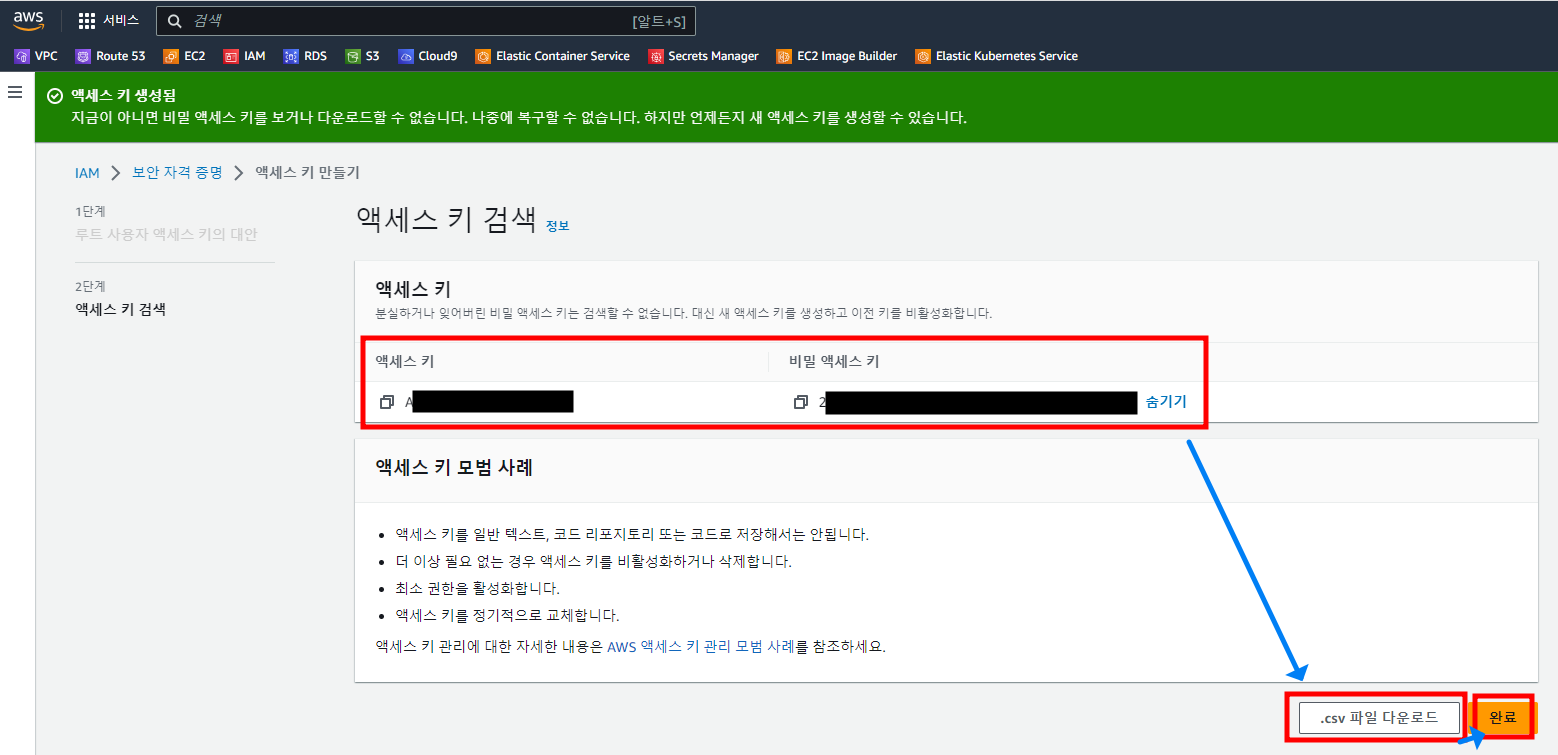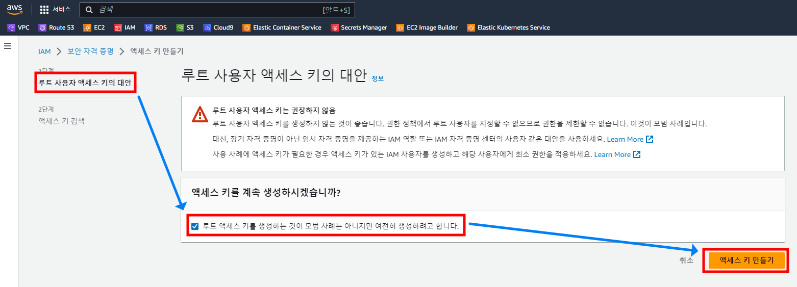 1.2.1.1. 루트 액세스키를 생성하는 것은~ 선택 후 -> 액세스 키 만들기 클릭