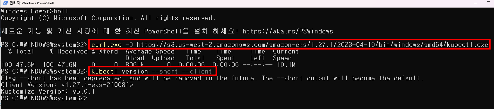 curl.exe -O https://s3.us-west-2.amazonaws.com/amazon-eks/1.27.1/2023-04-19/bin/windows/amd64/kubectl.exe