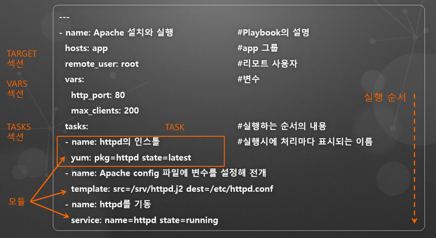 ansible 명령어 실행 # ansible-playbook i inventory_file playbook.yml3. playbook 구조