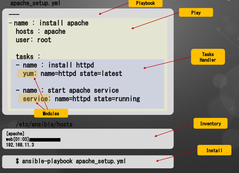 tasks: - name: check instal httpd yum: name=httpd state=latest3.2. Module