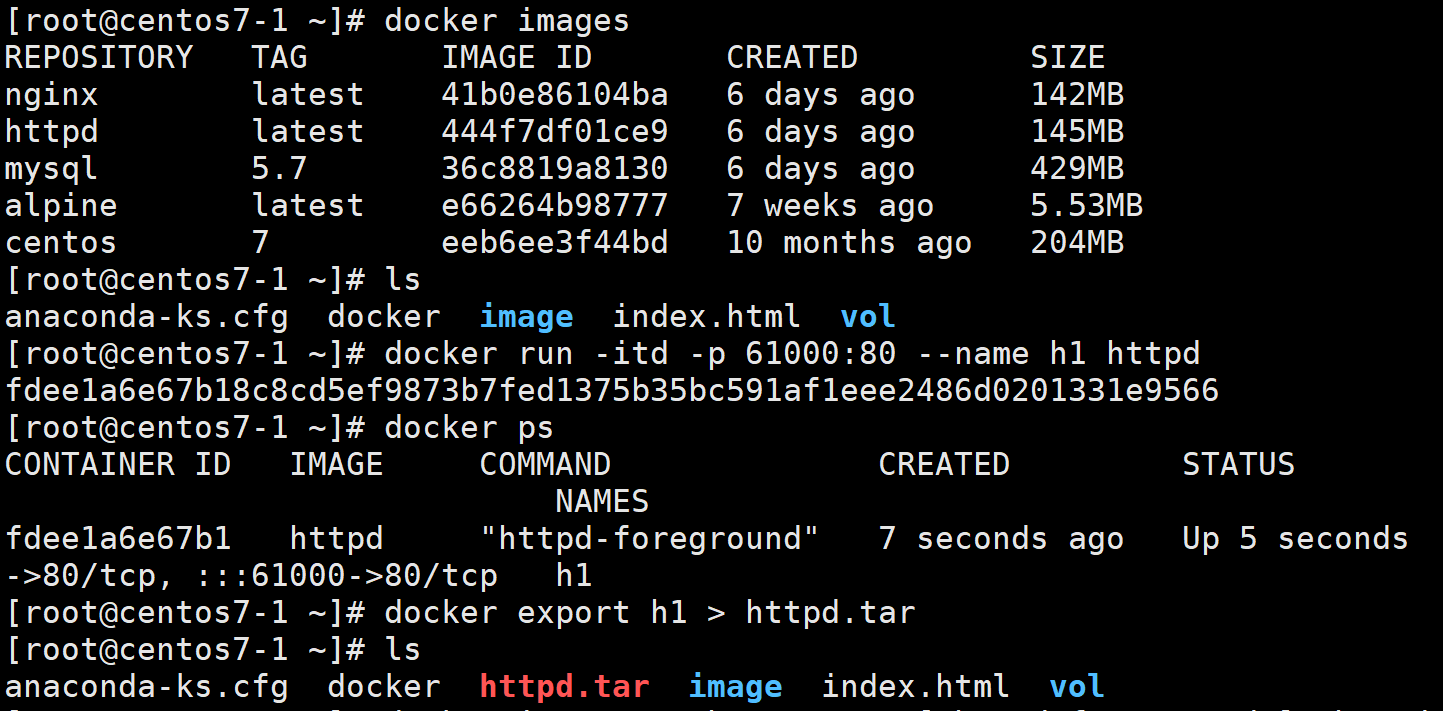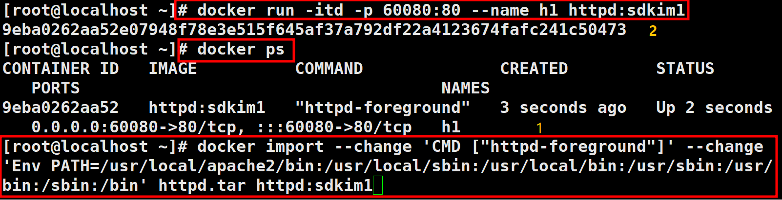 docker import --change 'CMD ["httpd-foreground"]' http.tar httpd:sdkim docker run -itd -e "PATH=/usr/local/apache2/bin:/usr/local/sbin:/usr/local/bin:/usr/sbin:/usr/bin:/sbin:/bin" -p 61000:80 --name h1 httpd:sdkim 위 두개의 작업을 하나의 작업으로 구성 docker import --change 'CMD ["httpd-foreground"]' --change 'Env PATH=/usr/local/apache2/bin:/usr/local/sbin:/usr/local/bin:/usr/sbin:/usr/bin:/sbin:/bin' httpd.tar httpd:sdkim1참고로 CentOS:7은 간단하게 /bin/bash만 import시 변경해 주면 되세요!