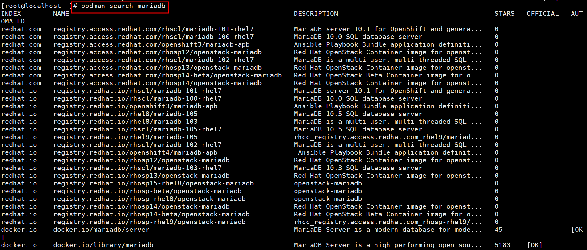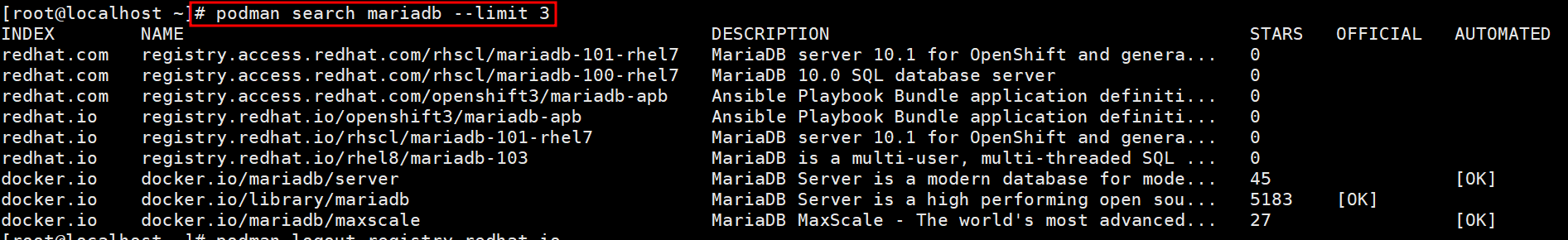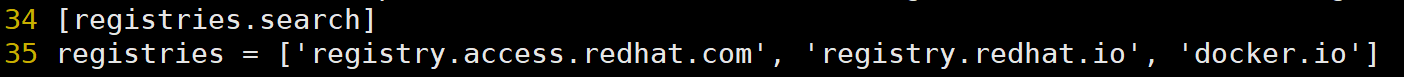 podman 역시 search 부분은 동일한 옵션을 사용합니다만 registry가 총 3개로 구성된 것이 차이점 입니다.