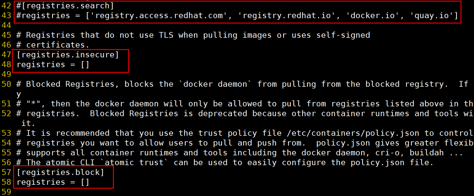# vi /etc/container/registries.conf해당 파일은 크게 3개 영역(section)으로 구성되어 있습니다.