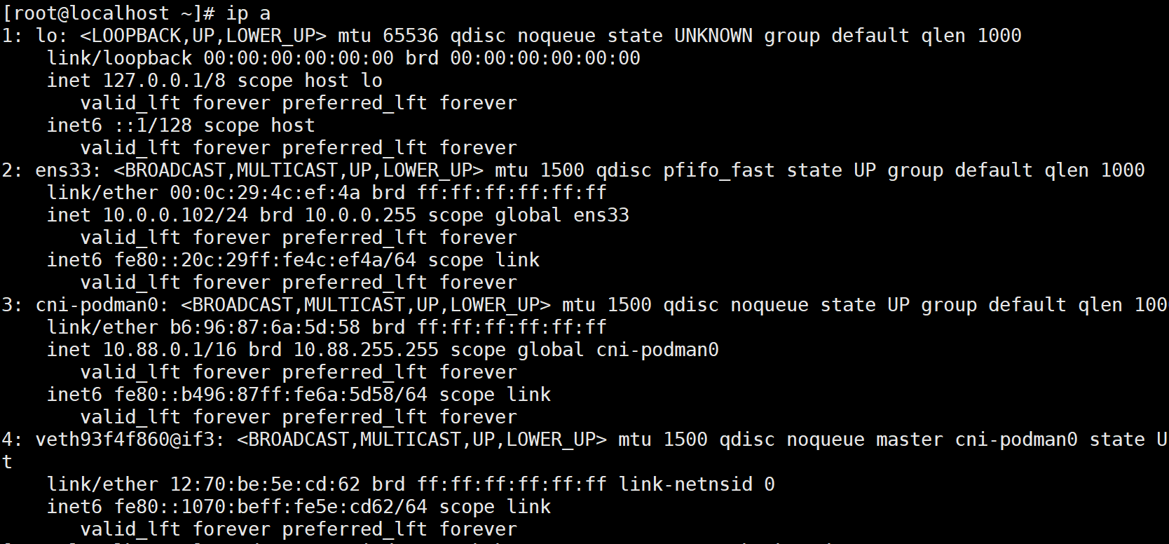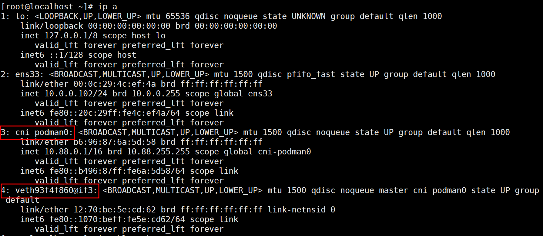 드디어 Host에서 cni-podman1이라는 브릿지와 vethxxxxx 포트가 보인다.