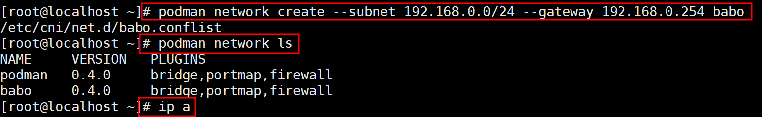# podman network create --subnet 192.168.0.0/24 --gateway 192.168.0.254 babo