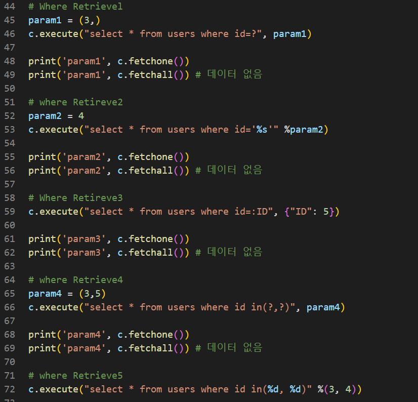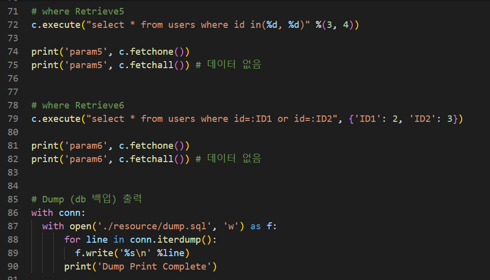 ''' 다양한 테이블 조회 1. SQLite 기본 사용법 2. select 3. where 4. Tuple, Dictionary Mapping ''' import sqlite3 conn = sqlite3.connect('./resource/database.db') # DB경로 c = conn.cursor() # 데이터 조회(전체) c.execute("select * from users") # 커서 위치 변경 # 1개 로우 선택 #print('One -> \n', c.fetchone()) # 지정 로우 선택 #print('Three -> \n', c.fetchmany(size=3)) # 전체 로우 선택 #print('All -> \n', c.fetchall()) #print('All -> \n', c.fetchall()) # 다음행에는 파일이 없음 # 순회1 #rows = c.fetchall() #for row in rows: # print('retrievel > ', row) # 순회2 가장 많이 사용 #for row in c.fetchall(): # print('retrieve2 > ', row) # 순회3 #for row in c.execute("select * from users order by id desc"): # print('retrieve3 > ', row) print('-------------------------------------------') # Where Retrievel param1 = (3,) c.execute("select * from users where id=?", param1) print('param1', c.fetchone()) print('param1', c.fetchall()) # 데이터 없음 # where Retireve2 param2 = 4 c.execute("select * from users where id='%s'" %param2) print('param2', c.fetchone()) print('param2', c.fetchall()) # 데이터 없음 # Where Retireve3 c.execute("select * from users where id=:ID", {"ID": 5}) print('param3', c.fetchone()) print('param3', c.fetchall()) # 데이터 없음 # where Retrieve4 param4 = (3,5) c.execute("select * from users where id in(?,?)", param4) print('param4', c.fetchone()) print('param4', c.fetchall()) # 데이터 없음 # where Retrieve5 c.execute("select * from users where id in(%d, %d)" %(3, 4)) print('param5', c.fetchone()) print('param5', c.fetchall()) # 데이터 없음 # where Retrieve6 c.execute("select * from users where id=:ID1 or id=:ID2", {'ID1': 2, 'ID2': 3}) print('param6', c.fetchone()) print('param6', c.fetchall()) # 데이터 없음 # Dump (db 백업) 출력 with conn: with open('./resource/dump.sql', 'w') as f: for line in conn.iterdump(): f.write('%s\n' %line) print('Dump Print Complete')