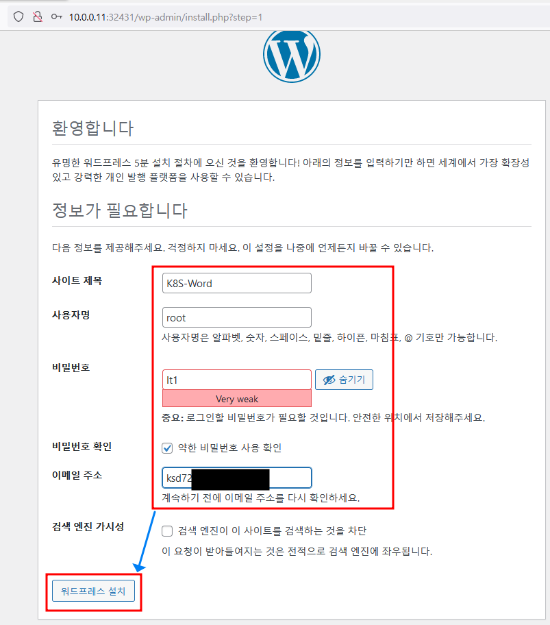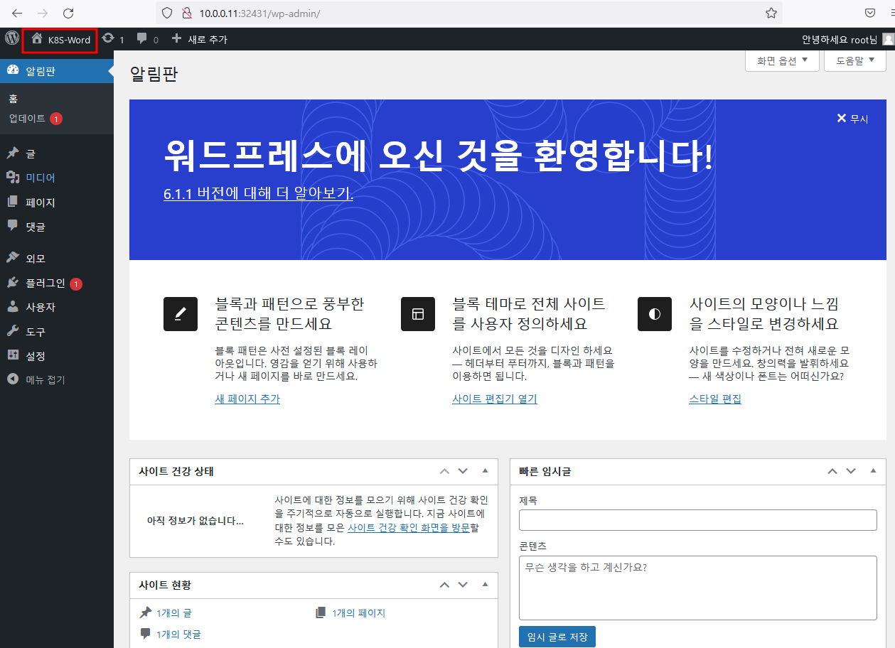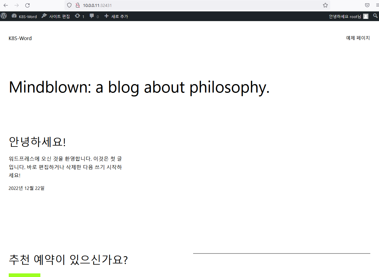 자 그럼 동일 POD내 wordpress + mysql 구성을 마쳤습니다.