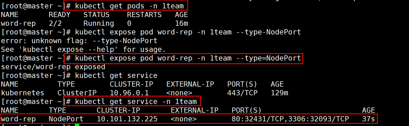 # kubectl expose pod word-rep -n 1team --type=NodePort2.2. 서비스 생성 확인