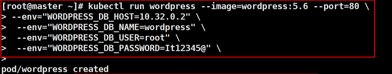 # kubectl run wordpress --image=wordpress:5.6 --port=80 \ --env="WORDPRESS_DB_HOST=10.32.0.2" \ --env="WORDPRESS_DB_NAME=wordpress" \ --env="WORDPRESS_DB_USER=root" \ --env="WORDPRESS_DB_PASSWORD=It12345@"