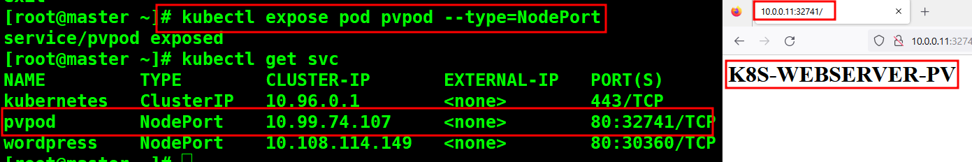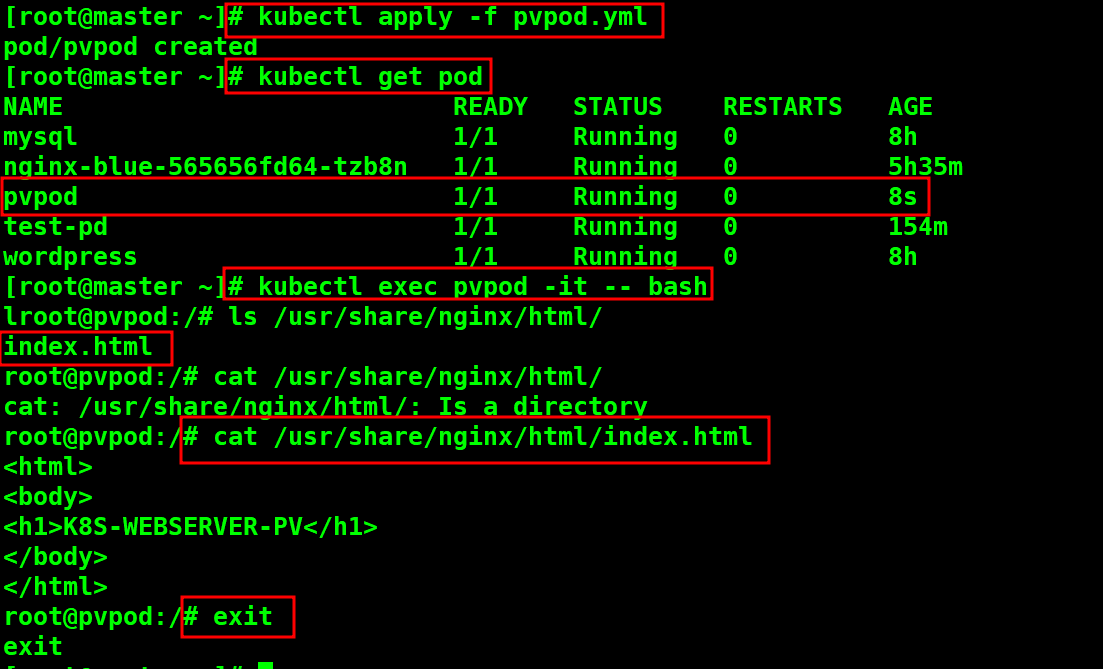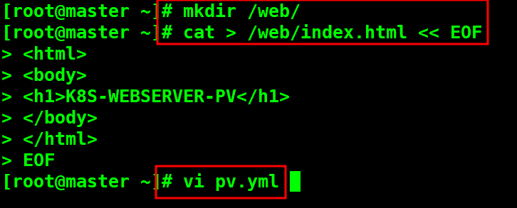 # mkdir /web/ # cat > /web/index.html << EOF # <html> # <body> # <h1>K8S-WEBSERVER-PV</h1> # </body> # </html> # EOF