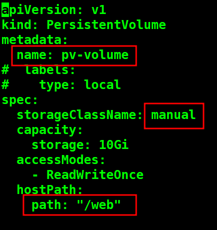 apiVersion: v1 kind: PersistentVolume metadata: name: pv-volume # labels: # type: local spec: storageClassName: manual capacity: storage: 10Gi accessModes: - ReadWriteOnce hostPath: path: "/web/"