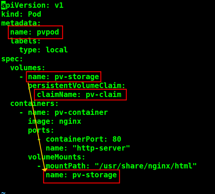 apiVersion: v1 kind: Pod metadata: name: pv-pod spec: volumes: - name: pv-storage persistentVolumeClaim: claimName: pv-claim containers: - name: pv-container image: nginx ports: - containerPort: 80 name: "http-server" volumeMounts: - mountPath: "/usr/share/nginx/html" name: pv-storage