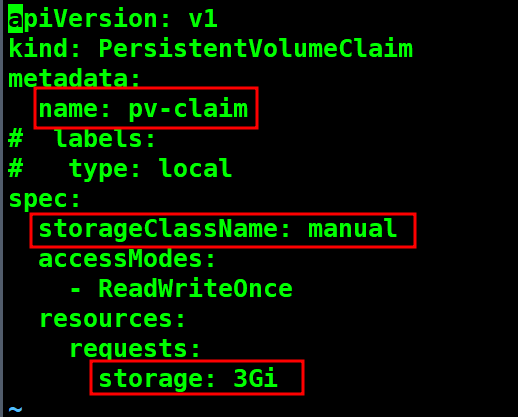 apiVersion: v1 kind: PersistentVolumeClaim metadata: name: pv-claim spec: storageClassName: web accessModes: - ReadWriteOnce resources: requests: storage: 3Gi