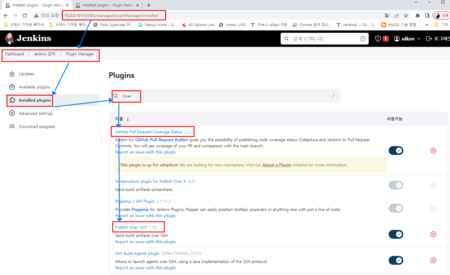 # mkdir /jenvar container에 mount할 볼륨 생성 # docker run -itd -p 60080:8080 \ -v /jenvar:/var/jenkins_home \ --name jen1 jenkins/jenkins:lts 가상머신이 아닌 host pc에서 브라우저 실행 http://가상머신IP:60080 접속 챕터1을 참고해서 환경설정 plugin 설치 Publish Over SSH, GitHub Pull Request Coverage Status3. 추가 container 설치
