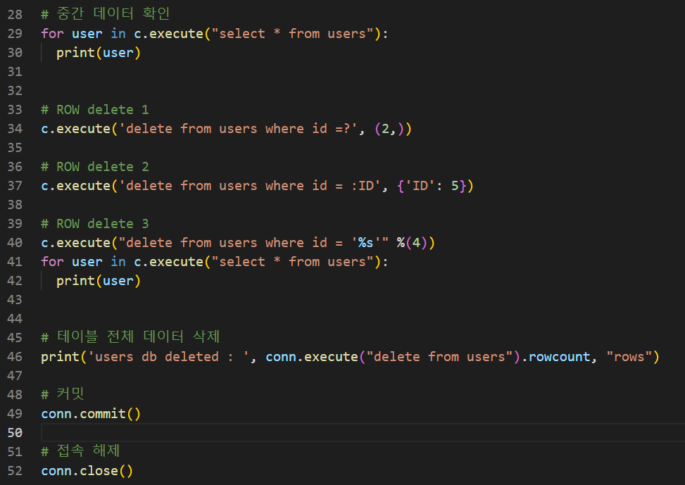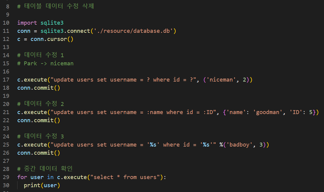 ''' 데이터 수정 및 삭제 1. update 2. delete 3. db 사용 권장 이유 ''' # 테이블 데이터 수정 삭제 import sqlite3 conn = sqlite3.connect('./resource/database.db') c = conn.cursor() # 데이터 수정 1 # Park -> niceman c.execute("update users set username = ? where id = ?", ('niceman', 2)) conn.commit() # 데이터 수정 2 c.execute("update users set username = :name where id = :ID", {'name': 'goodman', 'ID': 5}) conn.commit() # 데이터 수정 3 c.execute("update users set username = '%s' where id = '%s'" %('badboy', 3)) conn.commit() # 중간 데이터 확인 for user in c.execute("select * from users"): print(user) # ROW delete 1 c.execute('delete from users where id =?', (2,)) # ROW delete 2 c.execute('delete from users where id = :ID', {'ID': 5}) # ROW delete 3 c.execute("delete from users where id = '%s'" %(4)) for user in c.execute("select * from users"): print(user) # 테이블 전체 데이터 삭제 print('users db deleted : ', conn.execute("delete from users").rowcount, "rows") # 커밋 conn.commit() # 접속 해제 conn.close()