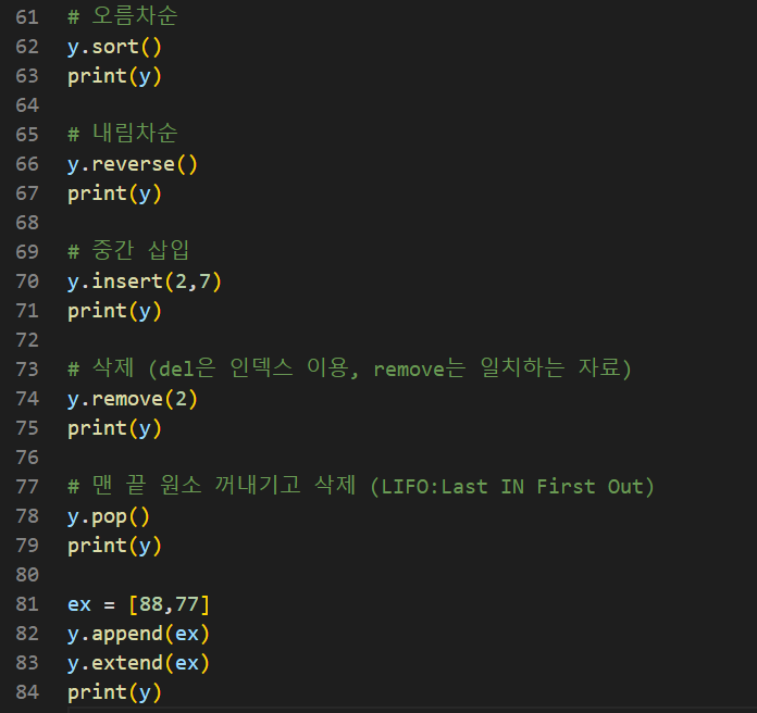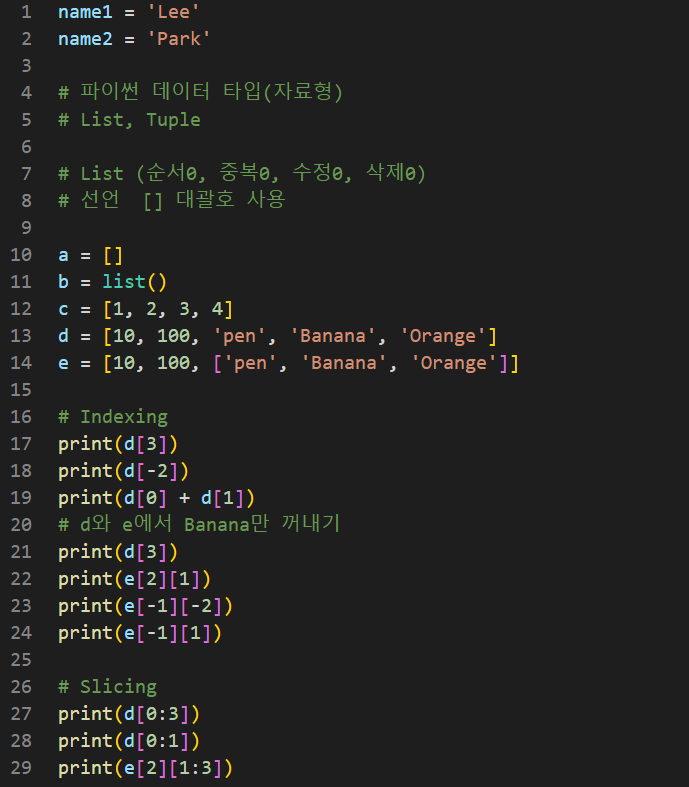 name1 = 'Lee' name2 = 'Park' # 파이썬 데이터 타입(자료형) # List, Tuple # List (순서0, 중복0, 수정0, 삭제0) # 선언 [] 대괄호 사용 a = [] b = list() c = [1, 2, 3, 4] d = [10, 100, 'pen', 'Banana', 'Orange'] e = [10, 100, ['pen', 'Banana', 'Orange']] # Indexing print(d[3]) print(d[-2]) print(d[0] + d[1]) # d와 e에서 Banana만 꺼내기 print(d[3]) print(e[2][1]) print(e[-1][-2]) print(e[-1][1]) # Slicing print(d[0:3]) print(d[0:1]) print(e[2][1:3]) # 연산 print(c + d) print(c * 3) #print(c[0] + 'hi') print(str(c[0]) + 'hi') # 리스트 수정 삭제 c[0] = 77 print(c) c[1:2] = [100, 1000, 10000] print(c) c[1] = ['a', 'b', 'c'] print(c) del c[1] print(c) del c[-1] print(c) print() print() # List 함수 y = [5,2,3,1,4] print(y) # 문자열 끝에 추가 y.append(6) print(y) # 오름차순 y.sort() print(y) # 내림차순 y.reverse() print(y) # 중간 삽입 y.insert(2,7) print(y) # 삭제 (del은 인덱스 이용, remove는 일치하는 자료) y.remove(2) print(y) # 맨 끝 원소 꺼내기고 삭제 (LIFO:Last IN First Out) y.pop() print(y) ex = [88,77] y.append(ex) y.extend(ex) print(y)