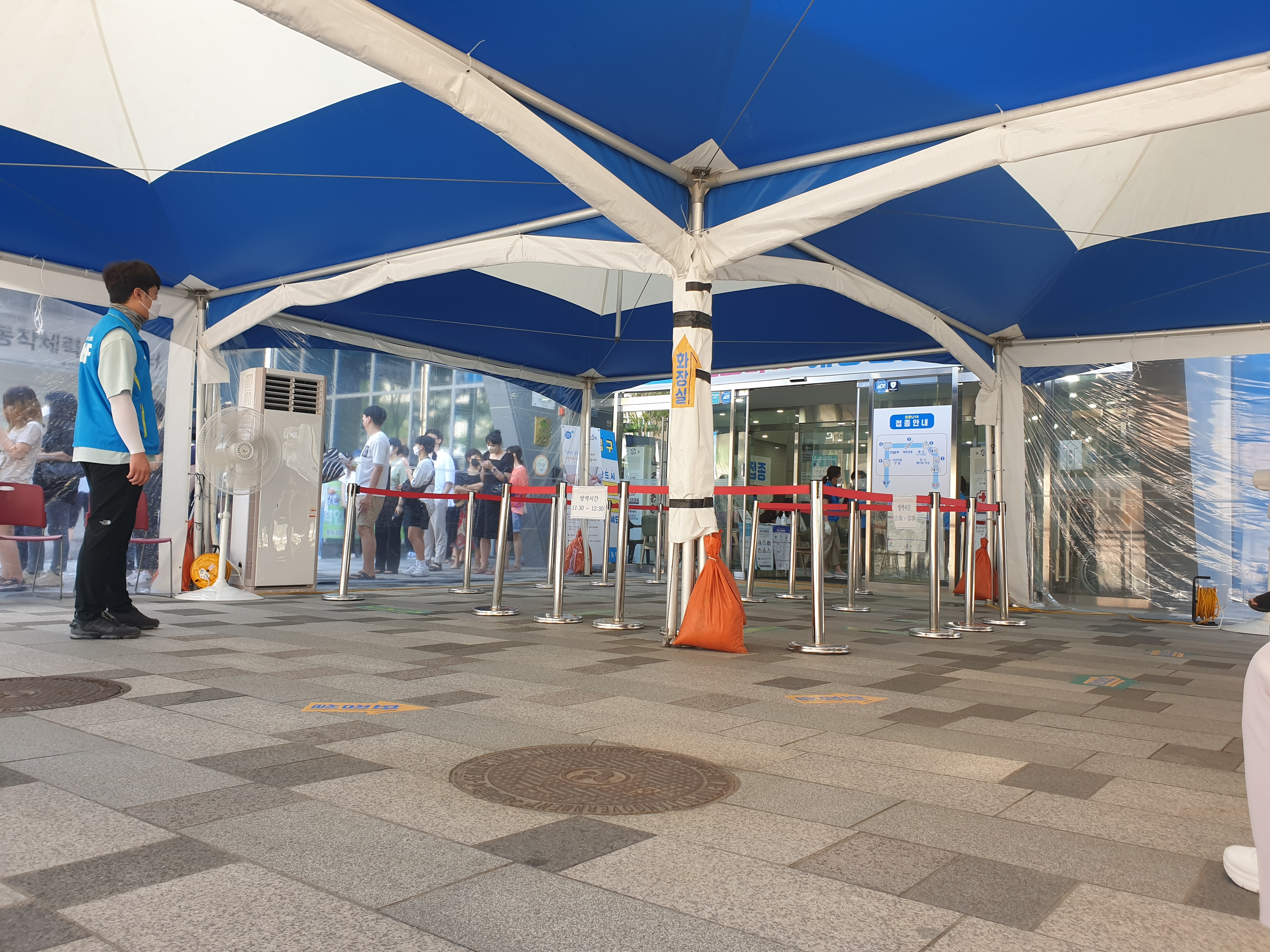 접종센터 천막 대기실 저 안까지만 들어가면 시원한데... 15분 정도 걸려서 다행히 천막 대기실로 입장!