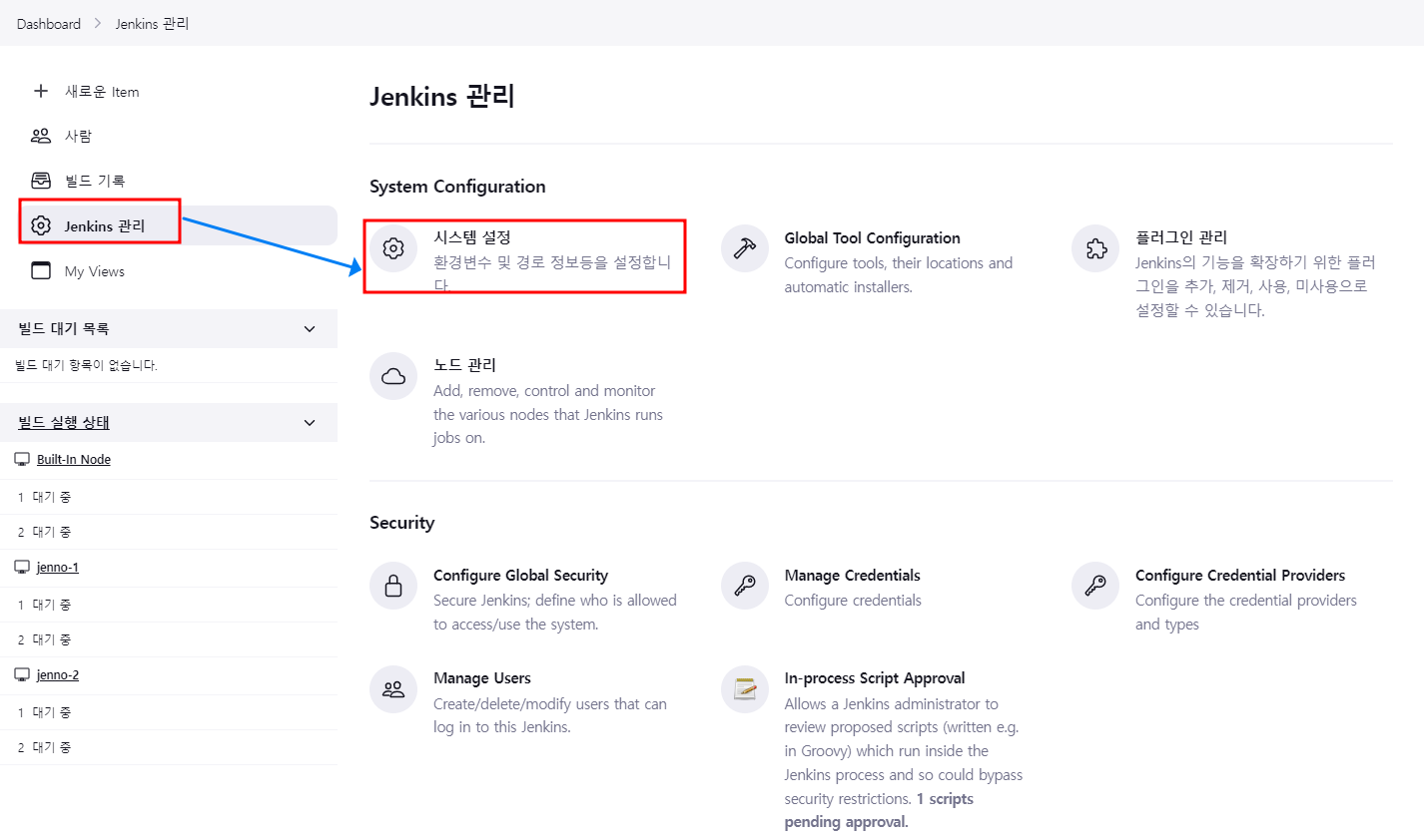 2.1.1. DashBoard의 'Jenkins 관리' -> '시스템설정' 클릭