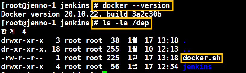 4.1.1. Node 1에서 설치된 Docker Version과 전송된 docker.sh 파일 확인