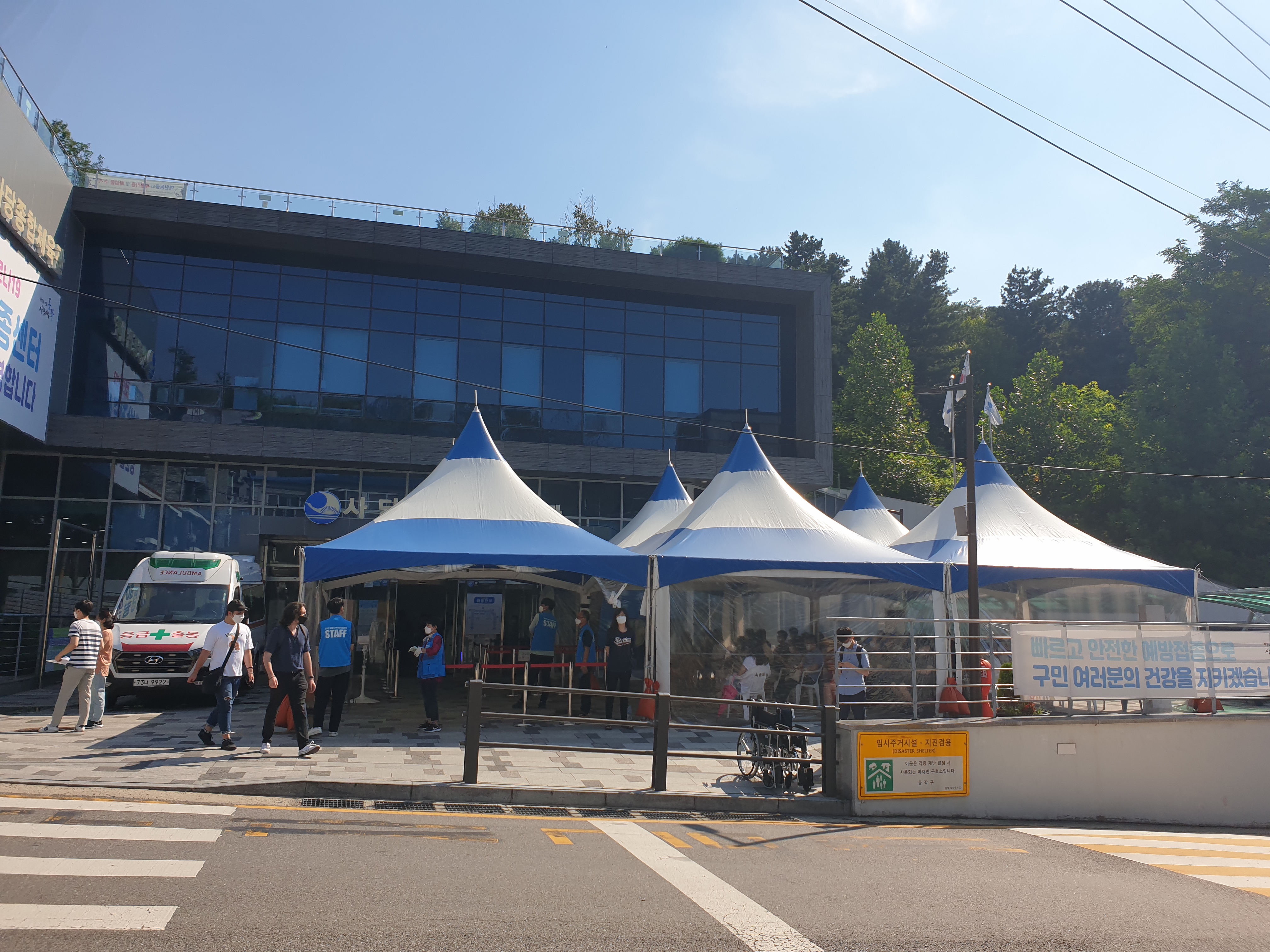접종센터 천막 대기실 저 안까지만 들어가면 시원한데... 15분 정도 걸려서 다행히 천막 대기실로 입장!