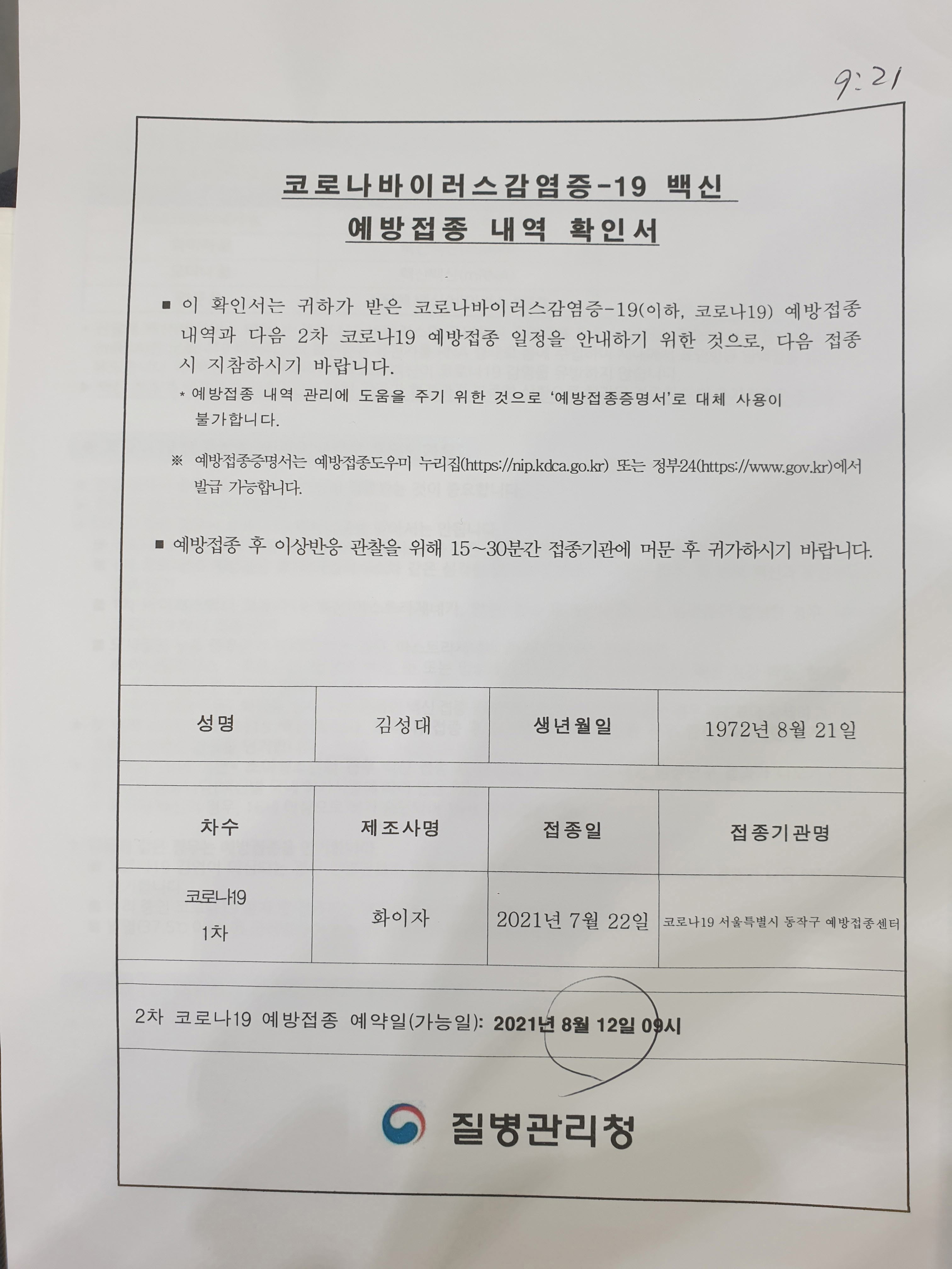 예방접종 내역서 3주뒤 2차 접종입니다.