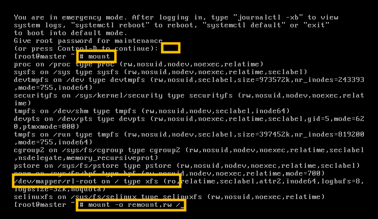 Password를 몰라서 Login을 하지 못하는 문제와 File System 문제로 Boot이 안될 시 문제해결 방법에는 조금 차이가 있습니다. File System 문제로 인하여 Booting이 안될 경우에는 해당 Booting Kernel 에서 문제를 해결해야 합니다. 물론 이때 Read Only 상태로 Booting이 진행되기 때문에 이 부분을 수정해서 /etc/fstab을 수정한 후 다시 Booting하면 문제가 해결됩니다.