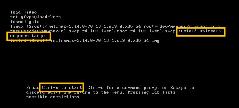 2.3. 4번째 줄 linux로 시작하는 Line의 가장 끝에 systemd.unit=emergency.target 입력 후 Ctrl+x 키로 시작