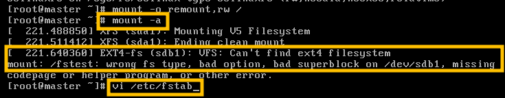 1.4. /etc/fstab에 등록 시 일부러 문제를 일으키기 위해서 xfs방식이 아닌 ext4로 기록