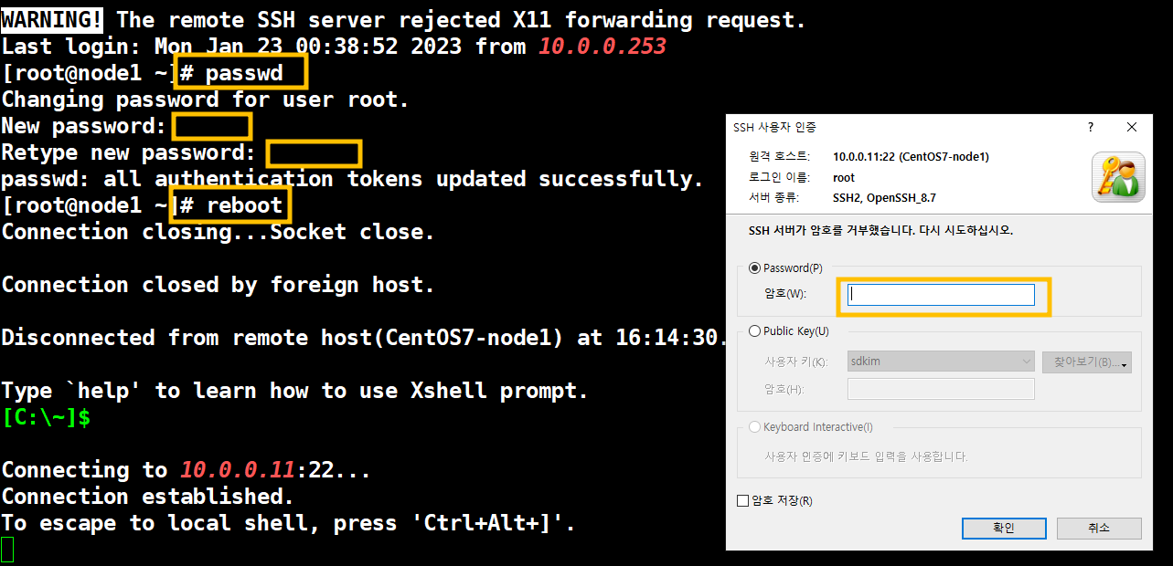 1.2. 패스워드를 변경하고 재부팅 해서 기존 패스워드가 더 이상 적용되지 않음을 확인합니다.
