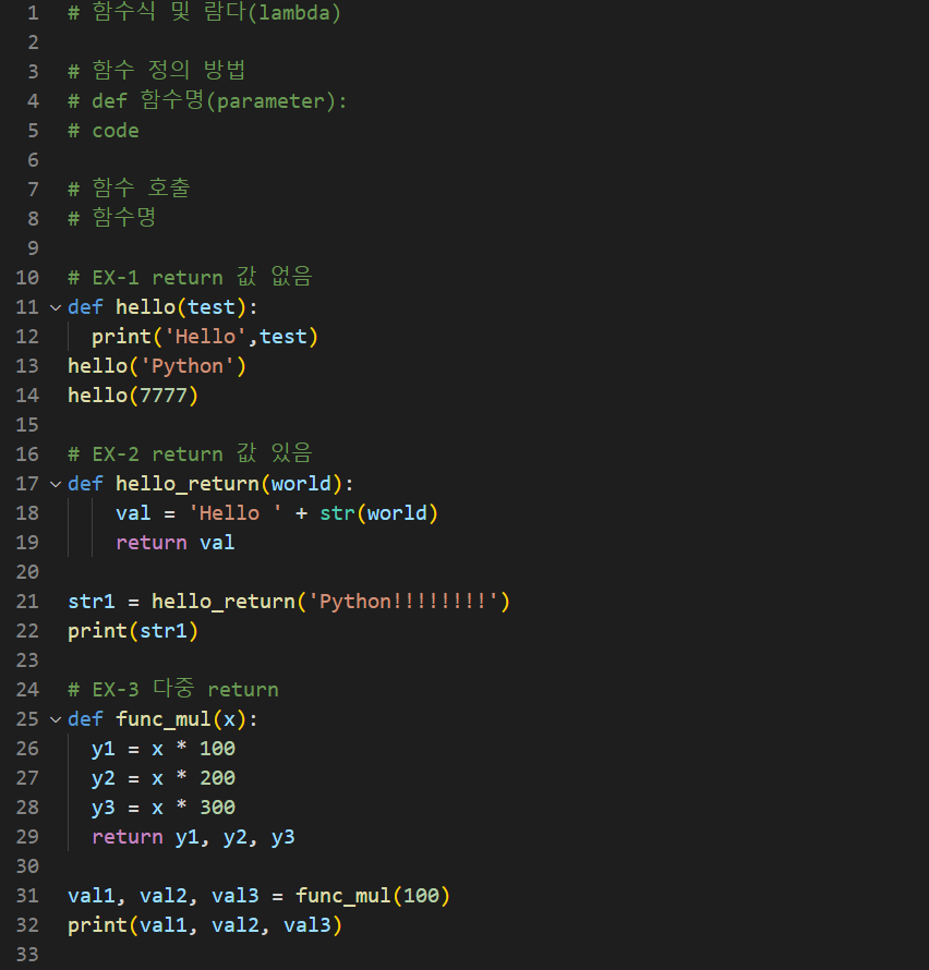 핵심을 잘 기억하세요!# 함수식 및 람다(lambda) # 함수 정의 방법 # def 함수명(parameter): # code # 함수 호출 # 함수명 # EX-1 return 값 없음 def hello(test): print('Hello',test) hello('Python') hello(7777) # EX-2 return 값 있음 def hello_return(world): val = 'Hello ' + str(world) return val str1 = hello_return('Python!!!!!!!!') print(str1) # EX-3 다중 return def func_mul(x): y1 = x * 100 y2 = x * 200 y3 = x * 300 return y1, y2, y3 val1, val2, val3 = func_mul(100) print(val1, val2, val3) # EX-4 # args(가변형의 매개변수 사용가능, 튜플), *kwagr(딕셔너리 형태) def args_func(*args): print(args) args_func('Kim') args_func('Kim', 'Park') args_func('Kim', 'Park', 'Lee') def args_func1(*args): for t in args: print(t) args_func1('Kim') args_func1('Kim', 'Park') args_func1('Kim', 'Park', 'Lee') # index 표시 def args_func(*args): for i,v in enumerate(args): print(i, v) args_func('Kim') args_func('Kim', 'Park') args_func('Kim', 'Park', 'Lee') # kwargs def kwargs_func(**kwargs): print(kwargs) kwargs_func(name1='Kim') kwargs_func(name1='Kim', name2='Park') kwargs_func(name1='Kim', name2='Park', name3='Lee') # kwagrs-1 def kwargs1_func(**kwargs): for k,v in kwargs.items(): print(k, v) kwargs1_func(name1='Kim') kwargs1_func(name1='Kim', name2='Park') kwargs1_func(name1='Kim', name2='Park', name3='Lee') # 전체 혼합 def exmaple_mul(arg1, arg2, *args, **kwargs): print(arg1, arg2, args, kwargs) exmaple_mul(10, 20) exmaple_mul(10, 20, 'park', 'kim', age1=24, age2=25) # 중첩 함수 (함수내 함수) def nested_func(num): def func_in_func(num): print('>>>',num) print('in func') func_in_func(num + 10000) nested_func(10000) # 예제 - 6 def func_mul(x): y1 = x * 100 y2 = x * 200 y3 = x * 300 return y1, y2, y3 val1, val2, val3 = func_mul(100) print(val1, val2, val3) def func1_mul(z : int) -> list: y11 = z * 100 y12 = z * 200 y13 = z * 300 return [y11, y12, y13] print(func1_mul(5)) # 람다식 # 람다식 : 메모리 절약, 가독성 향상, 코드 간결 # 함수는 객체 생성 -> 리소스(메모리 ) 할당 # 람다는 즉시 실행(heap 초기화) -> 메모리 초기화 # 일반적 함수 -> 변수 할당 def mul_1(num : int) -> int: return num * 10 var_func = mul_1 print(var_func) print(type(var_func)) lambda_mul_2 = lambda num : num * 10 print('>>>', lambda_mul_2(10)) ### 함수내 함수(람다식 사용 가능) def func_final(x, y, func): print(x * y * func(10)) func_final(10, 10, lambda_mul_2) # 1000이라는 값을 곱하려면 넣으려면 print(func_final(10, 10, lambda x :x *1000))
