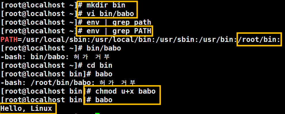 [root@localhost ~]# mkdir bin [root@localhost ~]# vi bin/babo #!/bin/bash echo "Hello, Linux" :wq [root@localhost ~]# env | grep PATH PATH=/usr/local/sbin:/usr/local/bin:/usr/sbin:/usr/bin:/root/bin: /root/bin 디렉토리가 PATH 경로에 존재함으로 babo 실행 가능 [root@localhost bin]# chmod u+x babo [root@localhost bin]# babo Hello, Linux