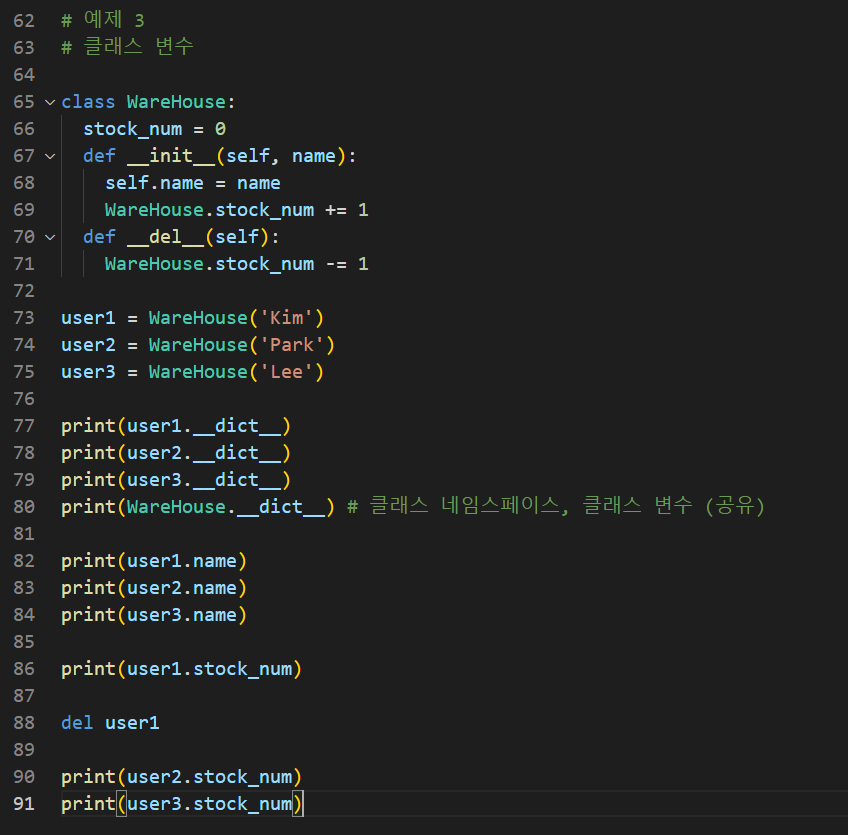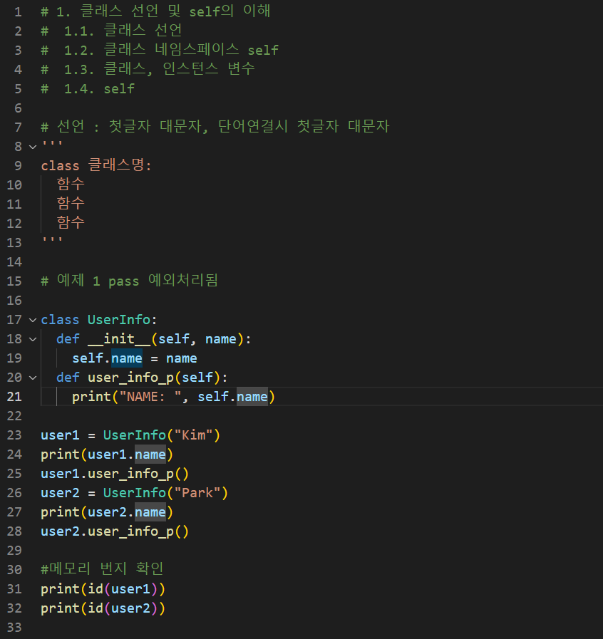 # 1. 클래스 선언 및 self의 이해 # 1.1. 클래스 선언 # 1.2. 클래스 네임스페이스 self # 1.3. 클래스, 인스턴스 변수 # 1.4. self # 선언 : 첫글자 대문자, 단어연결시 첫글자 대문자 ''' class 클래스명: 함수 함수 함수 ''' # 예제 1 pass 예외처리됨 class UserInfo: def __init__(self, name): self.name = name def user_info_p(self): print("NAME: ", self.name) user1 = UserInfo("Kim") print(user1.name) user1.user_info_p() user2 = UserInfo("Park") print(user2.name) user2.user_info_p() #메모리 번지 확인 print(id(user1)) print(id(user2)) #namespace 출력 print(user1.__dict__) print(user2.__dict__) # 클래스, 인스턴스 차이 중요 # 네임스페이스: 객체를 인스턴스화 할 때 저장된 공간 # 클래스 변수: 직접 사용가능, 객체보다 먼저 생성 # 인스턴스 변수: 객체마다 별도로 존재 # 예제2 # self의 이해 class SelfTest: def function1(): print('function1 called') def function2(self): print(id(self)) print('function2 called') self_test = SelfTest() #self_test.function1() self_test.function2() #인스턴스 생성해서 메쏘드 호출 SelfTest.function1() SelfTest.function2(self_test) # 클래스에서 직접 호출 print(id(self_test)) # 예제 3 # 클래스 변수 class WareHouse: stock_num = 0 def __init__(self, name): self.name = name WareHouse.stock_num += 1 def __del__(self): WareHouse.stock_num -= 1 user1 = WareHouse('Kim') user2 = WareHouse('Park') user3 = WareHouse('Lee') print(user1.__dict__) print(user2.__dict__) print(user3.__dict__) print(WareHouse.__dict__) # 클래스 네임스페이스, 클래스 변수 (공유) print(user1.name) print(user2.name) print(user3.name) print(user1.stock_num) del user1 print(user2.stock_num) print(user3.stock_num)