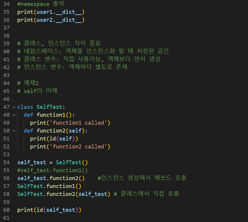 # 1. 클래스 선언 및 self의 이해 # 1.1. 클래스 선언 # 1.2. 클래스 네임스페이스 self # 1.3. 클래스, 인스턴스 변수 # 1.4. self # 선언 : 첫글자 대문자, 단어연결시 첫글자 대문자 ''' class 클래스명: 함수 함수 함수 ''' # 예제 1 pass 예외처리됨 class UserInfo: def __init__(self, name): self.name = name def user_info_p(self): print("NAME: ", self.name) user1 = UserInfo("Kim") print(user1.name) user1.user_info_p() user2 = UserInfo("Park") print(user2.name) user2.user_info_p() #메모리 번지 확인 print(id(user1)) print(id(user2)) #namespace 출력 print(user1.__dict__) print(user2.__dict__) # 클래스, 인스턴스 차이 중요 # 네임스페이스: 객체를 인스턴스화 할 때 저장된 공간 # 클래스 변수: 직접 사용가능, 객체보다 먼저 생성 # 인스턴스 변수: 객체마다 별도로 존재 # 예제2 # self의 이해 class SelfTest: def function1(): print('function1 called') def function2(self): print(id(self)) print('function2 called') self_test = SelfTest() #self_test.function1() self_test.function2() #인스턴스 생성해서 메쏘드 호출 SelfTest.function1() SelfTest.function2(self_test) # 클래스에서 직접 호출 print(id(self_test)) # 예제 3 # 클래스 변수 class WareHouse: stock_num = 0 def __init__(self, name): self.name = name WareHouse.stock_num += 1 def __del__(self): WareHouse.stock_num -= 1 user1 = WareHouse('Kim') user2 = WareHouse('Park') user3 = WareHouse('Lee') print(user1.__dict__) print(user2.__dict__) print(user3.__dict__) print(WareHouse.__dict__) # 클래스 네임스페이스, 클래스 변수 (공유) print(user1.name) print(user2.name) print(user3.name) print(user1.stock_num) del user1 print(user2.stock_num) print(user3.stock_num)