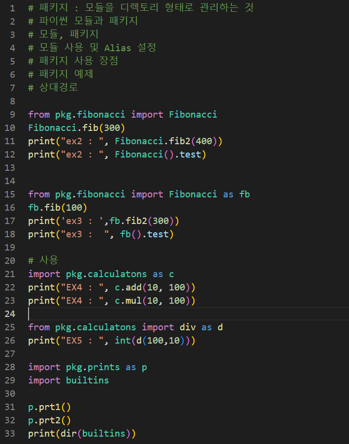 # 패키지 : 모듈을 디렉토리 형태로 관리하는 것 # 파이썬 모듈과 패키지 # 모듈, 패키지 # 모듈 사용 및 Alias 설정 # 패키지 사용 장점 # 패키지 예제 # 상대경로 from pkg.fibonacci import Fibonacci Fibonacci.fib(300) print("ex2 : ", Fibonacci.fib2(400)) print("ex2 : ", Fibonacci().test) from pkg.fibonacci import Fibonacci as fb fb.fib(100) print('ex3 : ',fb.fib2(300)) print("ex3 : ", fb().test) # 사용 import pkg.calculatons as c print("EX4 : ", c.add(10, 100)) print("EX4 : ", c.mul(10, 100)) from pkg.calculatons import div as d print("EX5 : ", int(d(100,10))) import pkg.prints as p import builtins p.prt1() p.prt2() print(dir(builtins))