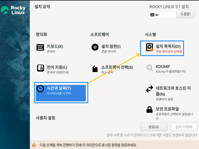 3.1. 시간과 날짜 -> 설치 목적지 -> KDUMP -> root 패스워드 -> 설치 시작 순입니다.