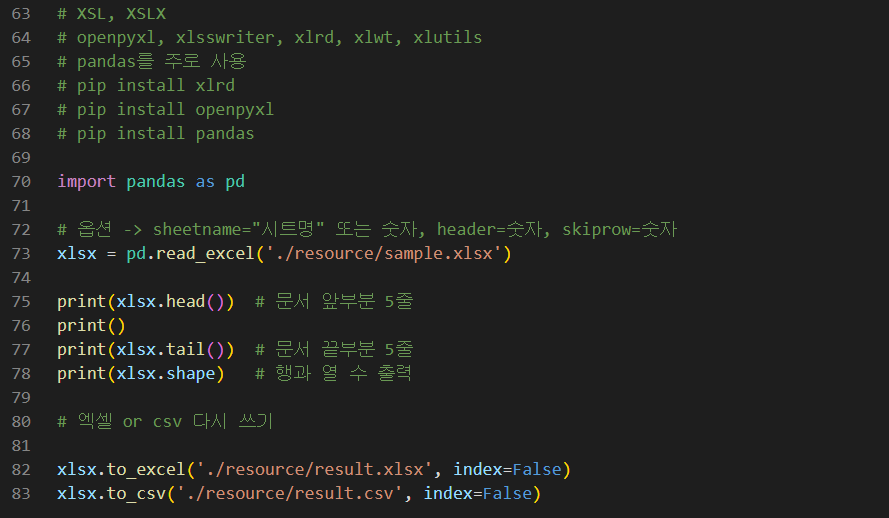 ''' Excel, CSV 처리 1. csv 읽기 2. csv 쓰기 3. xls, xlsx 읽기 4. 패키지 설치 ''' # 파이썬 외부 파일 처리 # 파이썬 Excel, CSV 파일 읽기 및 쓰기 # CSV : MIME - test/csv # 예제 1 import csv with open('./resource/sample1.csv', 'r') as f: reader = csv.reader(f) next(reader) # csv파일의 칼럼 list 제외 # 확인 print(reader) print(type(reader)) print(dir(reader)) print() for c in reader: print(c) # 예제 2 import csv with open('./resource/sample1.csv', 'r') as f: reader = csv.reader(f, delimiter='|') next(reader) # csv파일의 칼럼 list 제외 # 확인 print(reader) print(type(reader)) print(dir(reader)) print() for c in reader: print(c) # 예제 3 with open('./resource/sample1.csv', 'r') as f: reader = csv.DictReader(f) for c in reader: print(c) # 예제 4 w = [[1,2,3],[4,5,6],[7,8,9],[10,11,12],[13,14,15],[16,17,18]] with open('./resource/sample4.csv', 'w', newline='') as f: # newline 한줄 제거 wt = csv.writer(f) for v in w: # 특정 조건을 필터링 할 경우는 for문이 적당 wt.writerow(v) # 예제 5 with open('./resource/sample5.csv', 'w', newline='') as f: wt = csv.writer(f) wt.writerows(w) # XSL, XSLX # openpyxl, xlsswriter, xlrd, xlwt, xlutils # pandas를 주로 사용 # pip install xlrd # pip install openpyxl # pip install pandas import pandas as pd # 옵션 -> sheetname="시트명" 또는 숫자, header=숫자, skiprow=숫자 xlsx = pd.read_excel('./resource/sample.xlsx') print(xlsx.head()) # 문서 앞부분 5줄 print() print(xlsx.tail()) # 문서 끝부분 5줄 print(xlsx.shape) # 행과 열 수 출력 # 엑셀 or csv 다시 쓰기 xlsx.to_excel('./resource/result.xlsx', index=False) xlsx.to_csv('./resource/result.csv', index=False)