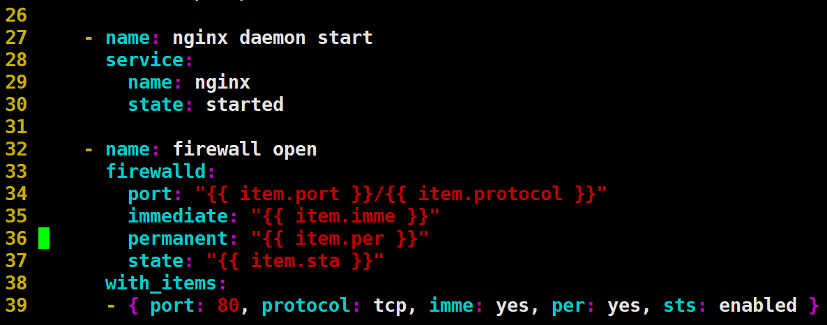 --- - name: nginx configuration hosts: all tasks: - name: nginx install yum: name: nginx state: latest - name: mkdir /www file: path: /www state: directory - name: nginx config lineinfile: path: /etc/nginx/nginx.conf regexp: '^(\s+root\s+)/usr/share/nginx/html;' line: "\troot /www;" - name: nginx index.html copy copy: src: ./index.html dest: /www/index.html - name: nginx daemon start service: name: nginx state: started - name: firewall open firewalld: port: "{{ item.port }}/{{ item.protocol }}" immediate: "{{ item.imme }}" permanent: "{{ item.per }}" state: "{{ item.sta }}" with_items: - { port: 80, protocol: tcp, imme: yes, per: yes, sts: enabled }2. Playbook