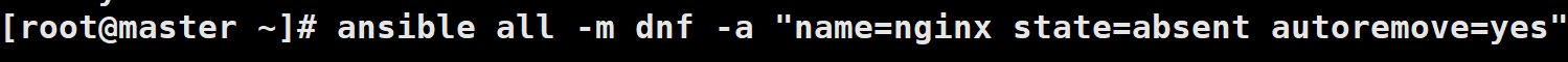 # ansible all -m dnf -a "name=nginx state=absent autoremove=yes"