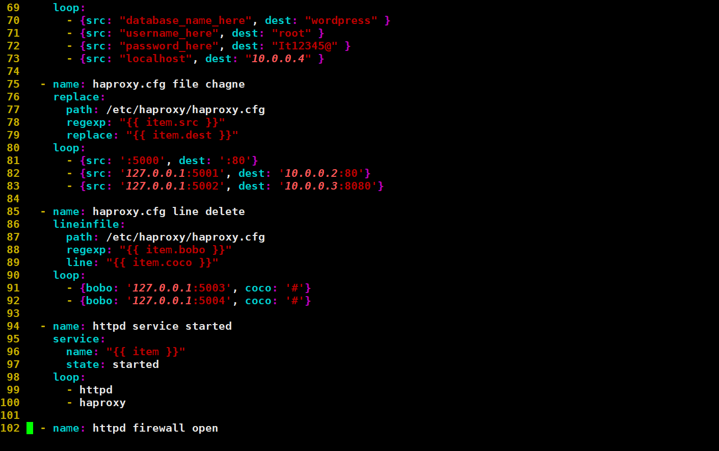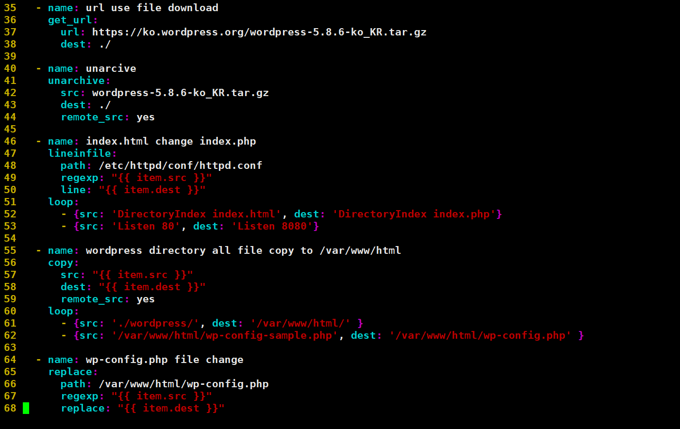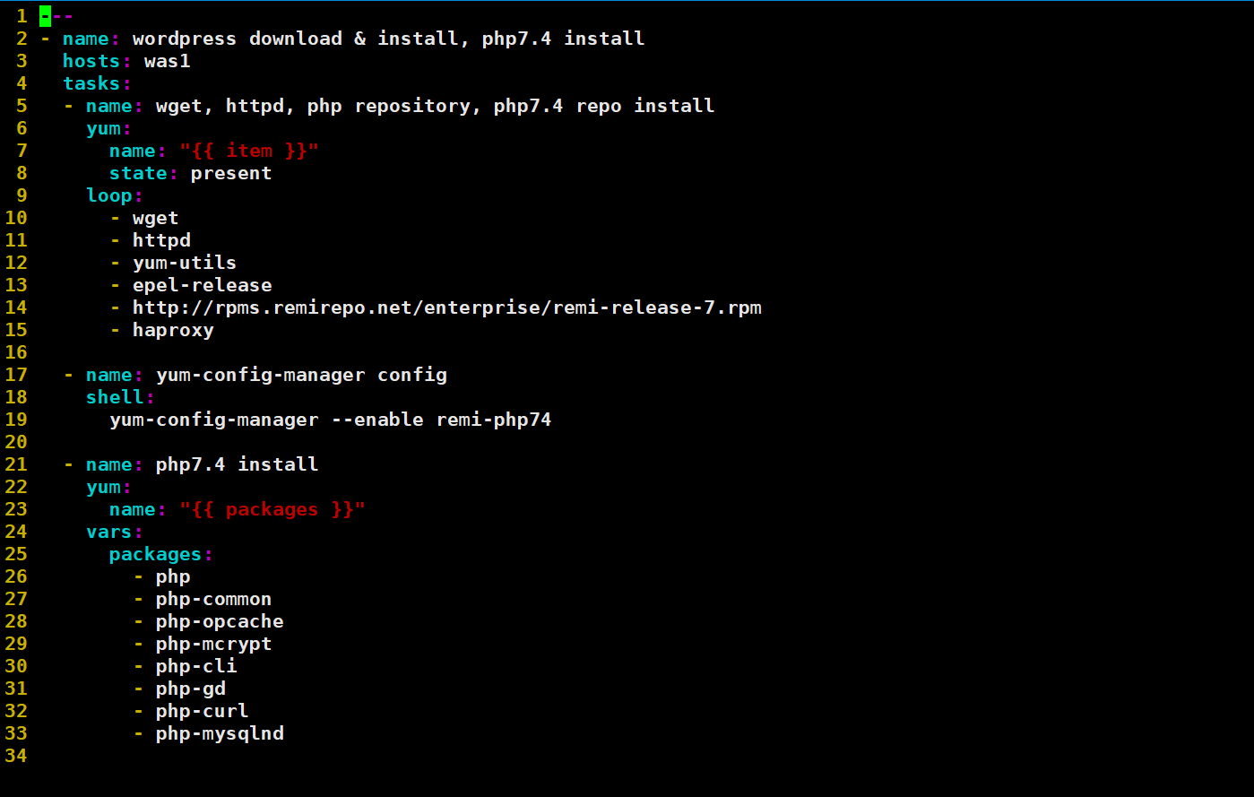 --- - name: wordpress download & install, php7.4 install hosts: was1 tasks: - name: wget, httpd, php repository, php7.4 repo install yum: name: "{{ item }}" state: present loop: - wget - httpd - yum-utils - epel-release - http://rpms.remirepo.net/enterprise/remi-release-7.rpm - haproxy - name: yum-config-manager config shell: yum-config-manager --enable remi-php74 - name: php7.4 install yum: name: "{{ packages }}" vars: packages: - php - php-common - php-opcache - php-mcrypt - php-cli - php-gd - php-curl - php-mysqlnd - name: url use file download get_url: url: https://ko.wordpress.org/wordpress-5.8.6-ko_KR.tar.gz dest: ./ - name: unarcive unarchive: src: wordpress-5.8.6-ko_KR.tar.gz dest: ./ remote_src: yes - name: index.html change index.php lineinfile: path: /etc/httpd/conf/httpd.conf regexp: "{{ item.src }}" line: "{{ item.dest }}" loop: - {src: 'DirectoryIndex index.html', dest: 'DirectoryIndex index.php'} - {src: 'Listen 80', dest: 'Listen 8080'} - name: wordpress directory all file copy to /var/www/html copy: src: "{{ item.src }}" dest: "{{ item.dest }}" remote_src: yes loop: - {src: './wordpress/', dest: '/var/www/html/' } - {src: '/var/www/html/wp-config-sample.php', dest: '/var/www/html/wp-config.php' } - name: wp-config.php file change replace: path: /var/www/html/wp-config.php regexp: "{{ item.src }}" replace: "{{ item.dest }}" loop: - {src: "database_name_here", dest: "wordpress" } - {src: "username_here", dest: "root" } - {src: "password_here", dest: "It12345@" } - {src: "localhost", dest: "10.0.0.4" } - name: haproxy.cfg file chagne replace: path: /etc/haproxy/haproxy.cfg regexp: "{{ item.src }}" replace: "{{ item.dest }}" loop: - {src: ':5000', dest: ':80'} - {src: '127.0.0.1:5001', dest: '10.0.0.2:80'} - {src: '127.0.0.1:5002', dest: '10.0.0.3:8080'} - name: haproxy.cfg line delete lineinfile: path: /etc/haproxy/haproxy.cfg regexp: "{{ item.bobo }}" line: "{{ item.coco }}" loop: - {bobo: '127.0.0.1:5003', coco: '#'} - {bobo: '127.0.0.1:5004', coco: '#'} - name: httpd service started service: name: "{{ item }}" state: started loop: - httpd - haproxy - name: httpd firewall open firewalld: port: "{{ item }}" state: enabled loop: - 80/tcp - 8080/tcp2. code 작성